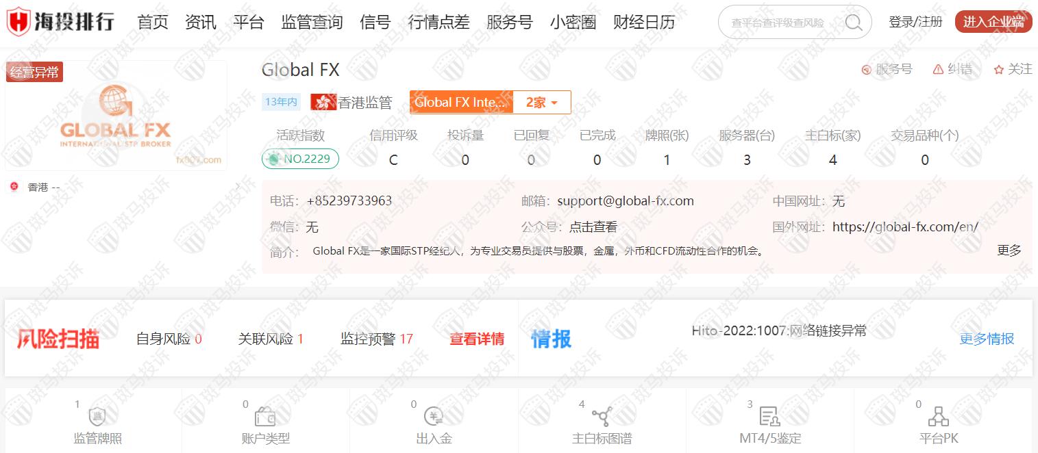 这家平台叫Global FX,成立于2009年,全球排名2229名,目前经营异常,无监管,没有外汇牌照,不能做外汇保证金交易,风险扫描显示17条风险,投资者资金安全无保障。