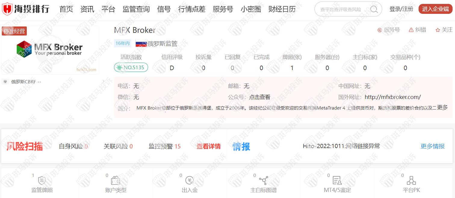 这家平台叫MFX Broker,成立于2017年,全球排名5009名,目前已停止经营,曾宣称由俄罗斯CBRF监管,但已撤销,没有外汇牌照,不能做外汇保证金交易,风险扫描显示15条风险,投资者资金安全无保障。