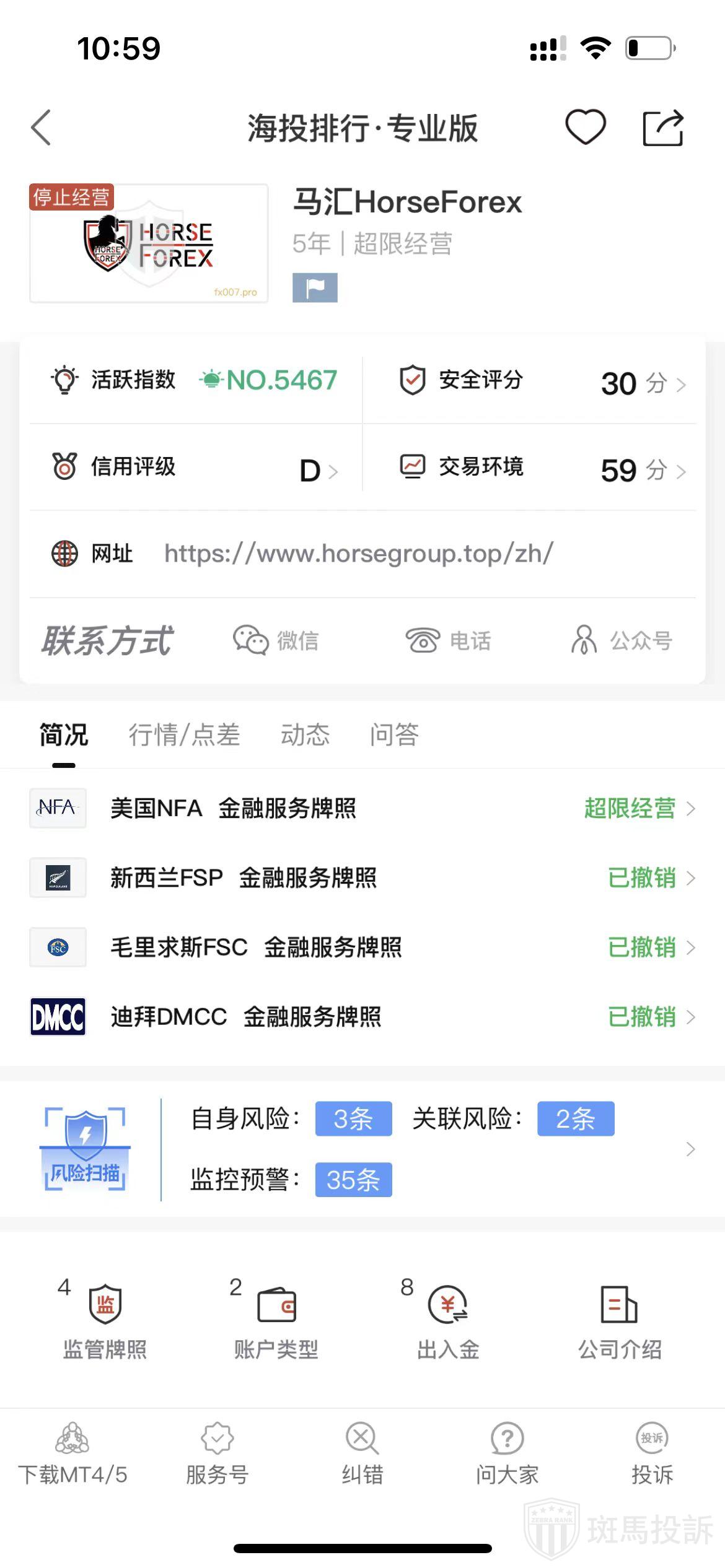 根据海投排行查询显示,这家平台叫HorseForex马汇,成立于2019年,全球排名5467名,安全评分30分,平台宣传称拥有新西兰FSP、美国NFA、毛里求斯FSC和迪拜DMCC等多个国家的监管牌照,风险扫描预警有40条.