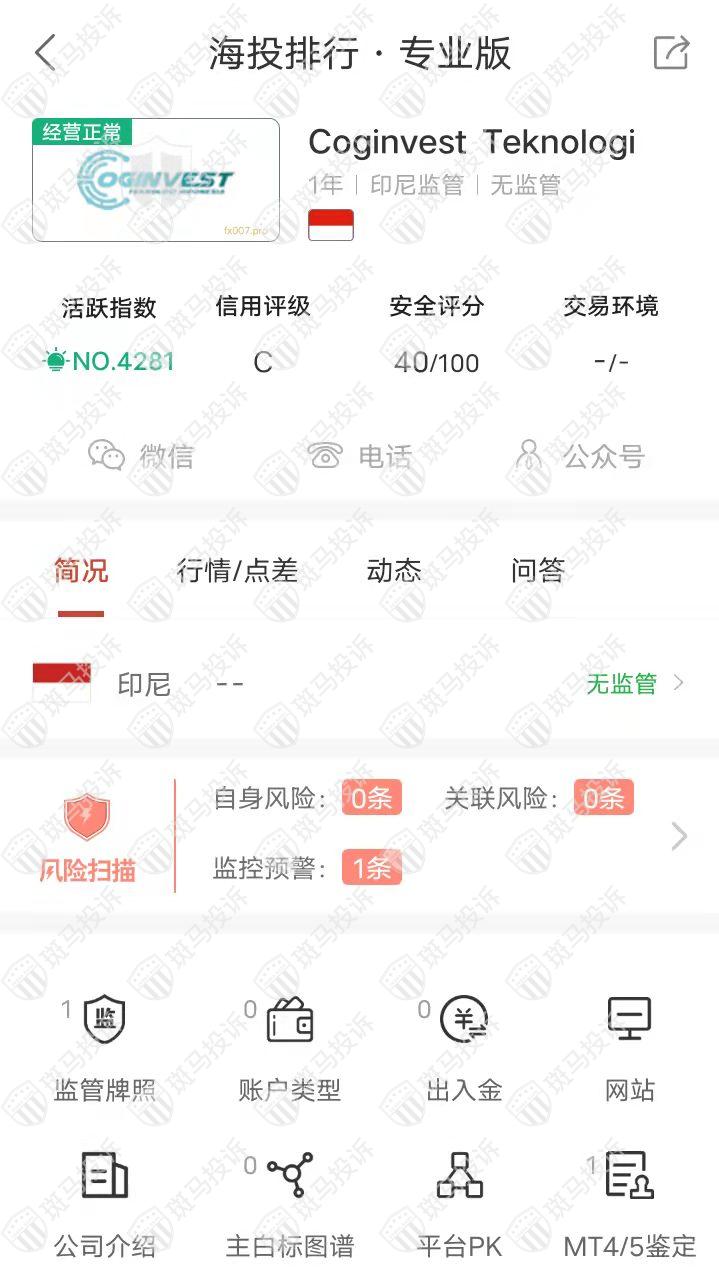 这家平台叫Coginvest Teknologi,成立于2022年,全球活跃指数4281名,目前无监管,没有外汇牌照,不能做外汇保证金交易,风险扫描显示1条风险,投资者资金安全无保障。