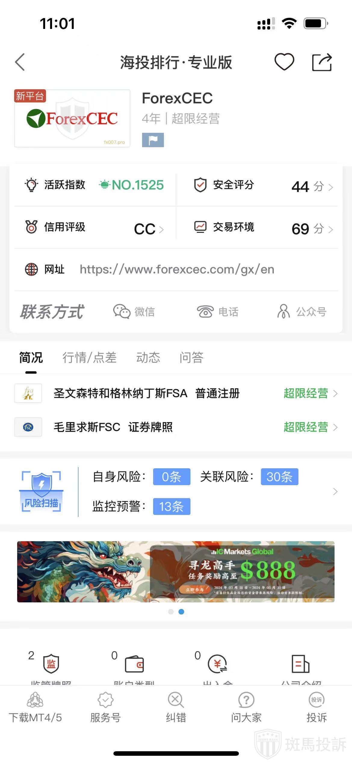 根据海投排行查询显示,这家平台叫ForexCEC,成立于2020年,全球排名1525名,安全评分44分,目前有圣文森特和格林纳丁斯FSA普通注册、毛里求斯FSC证券牌照2个监管牌照,风险扫描预警有43条.