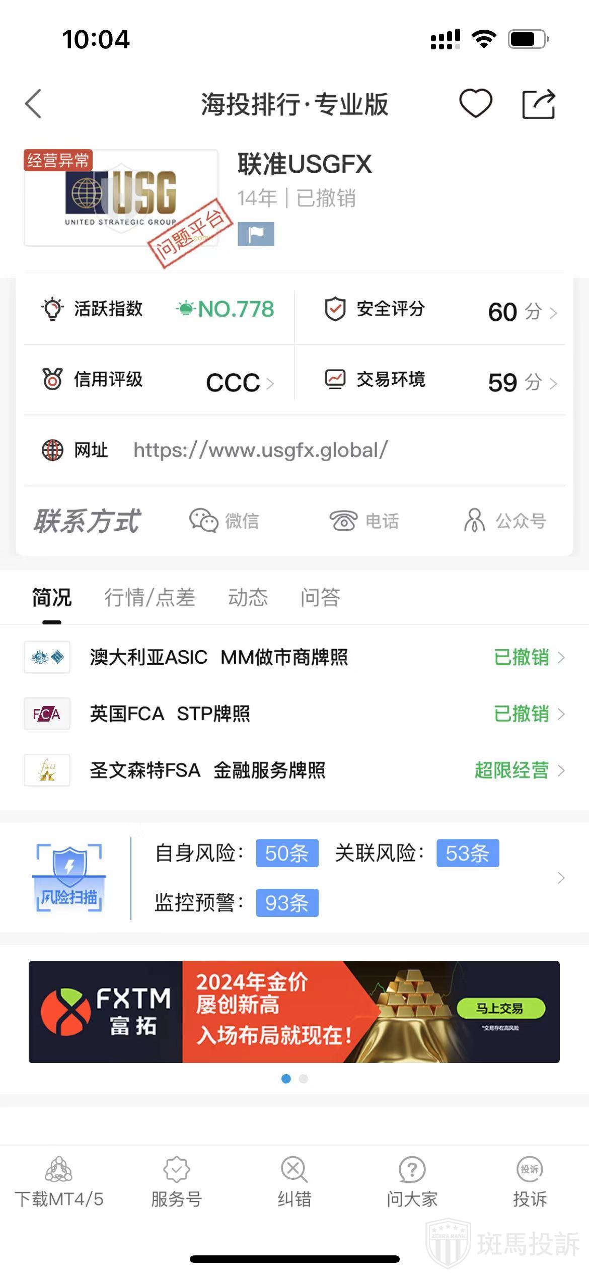 根据海投排行查询显示,这家平台叫联准USGFX,成立于2010年,全球排名778名,安全评分70分,平台宣传称拥有英国FCA STP牌照、圣文森特FSA金融服务牌照和澳大利亚ASIC市商牌照的监管,风险扫描196条。