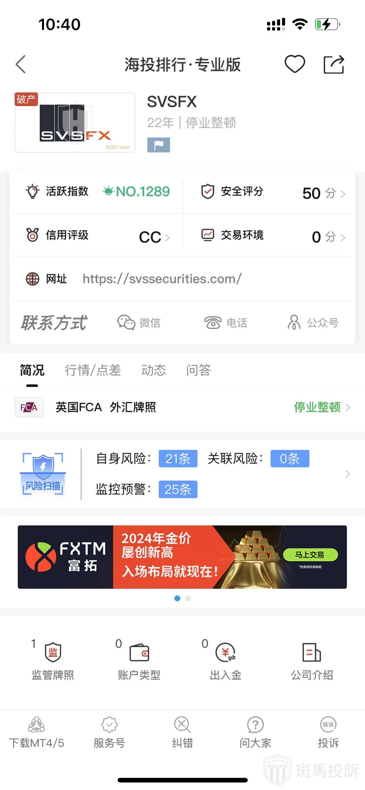 根据海投排行查询显示,这家平台叫SVSFX,成立于2002年,全球排名1290名,安全评分50分,平台宣传称拥有英国FCA外汇牌照,目前显示已经停业整顿,风险扫描46条。
