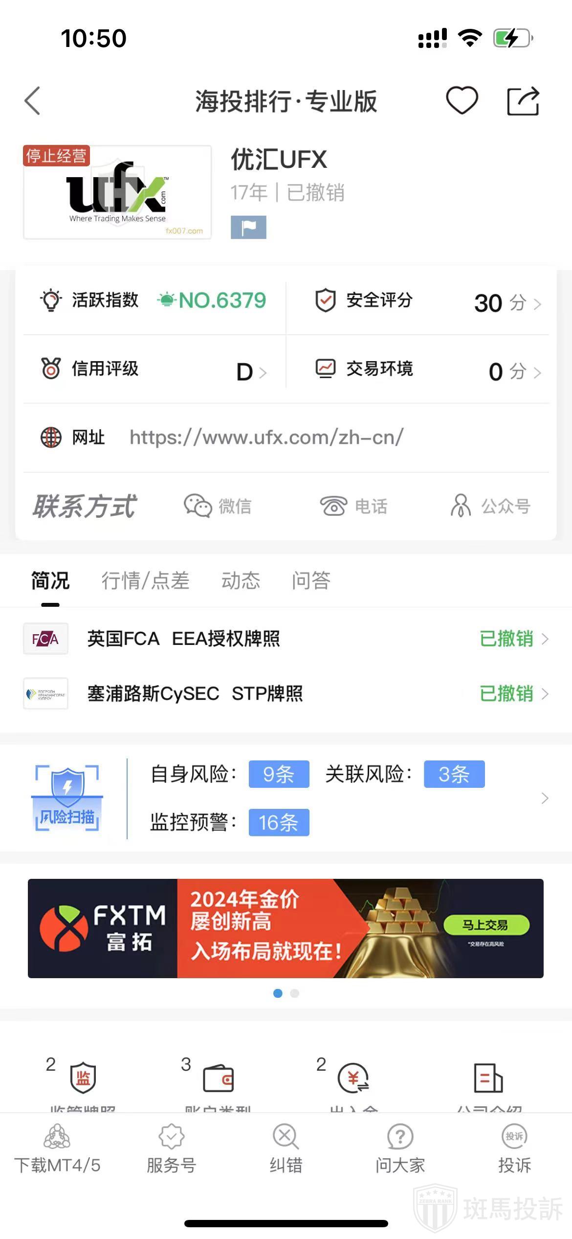 根据海投排行查询显示,这家平台叫优汇UFX,成立于2007年,全球排名6379名,安全评分30分,平台宣传称拥有英国FCA外汇牌照和塞浦路斯CySEC STP牌照,根据目前的最新查询结果得知,该平台的监管牌照已经被撤销,目前不具备监管外汇交易资质的作用,资金安全无保障,风险扫描预警有28条.