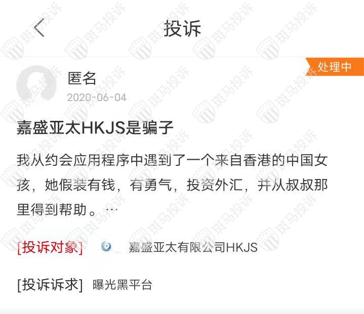 WMFX Trade完美福星的关联平台嘉盛亚太有限公司HKJS目前在斑马投诉已收到1条投诉,且仍在处理中。