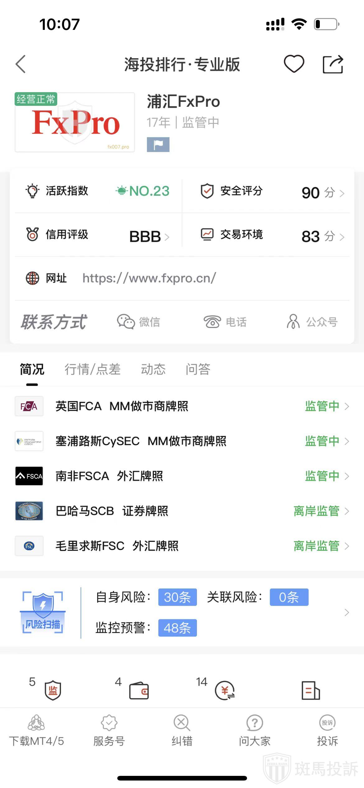 根据海投排行查询显示,这家平台叫浦汇FxPro,成立于2007年,全球排名23名,安全评分90分,平台宣传称拥有英国FCA外汇牌照、南非FSCA外汇牌照,巴哈马SCB证券牌、毛里求斯FSC外汇牌照和塞浦路斯CySEC市商牌照,根据目前的最新查询结果得知,其中的巴哈马SCB和毛里求斯FSC是属于离岸监管的牌照,这两个牌照监管力度不够,入金前要先确定自己的账户是开在什么监管之下,风险扫描预警有78条.