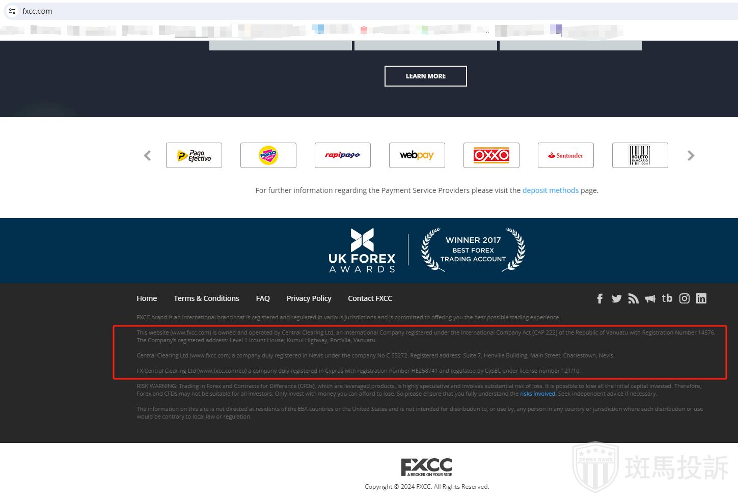2. 塞浦路斯:FX Central Clearing Ltd(www.fxcc.eu)受塞浦路斯证券交易委员会(CySEC)授权和监管,牌照号为121/10。该公司只向欧洲经济区(EEA)国家的居民提供服务。