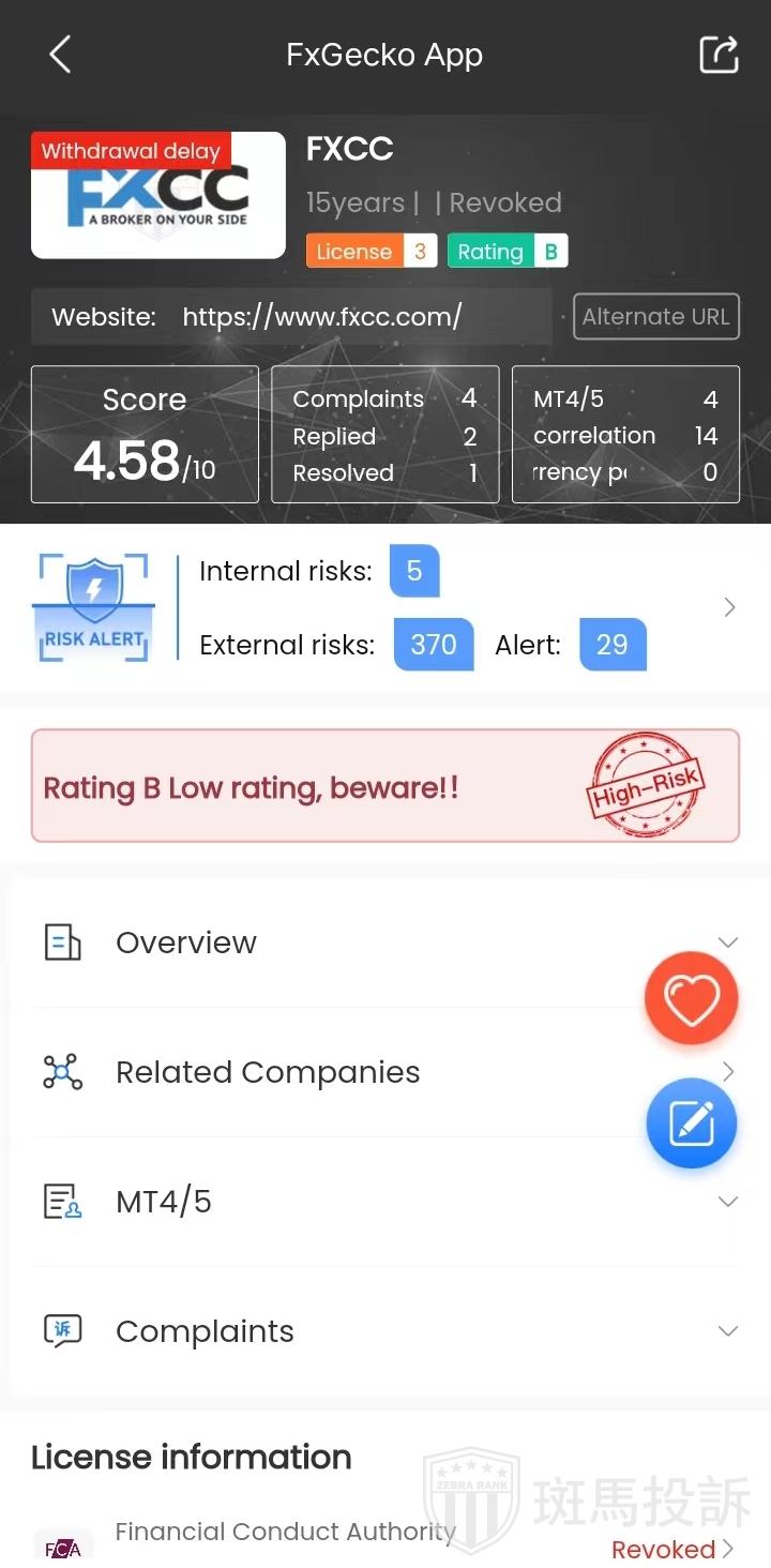 根据 FxGecko app提供的信息,以下是与外汇经纪商 FXCC 相关的一些风险信号:
