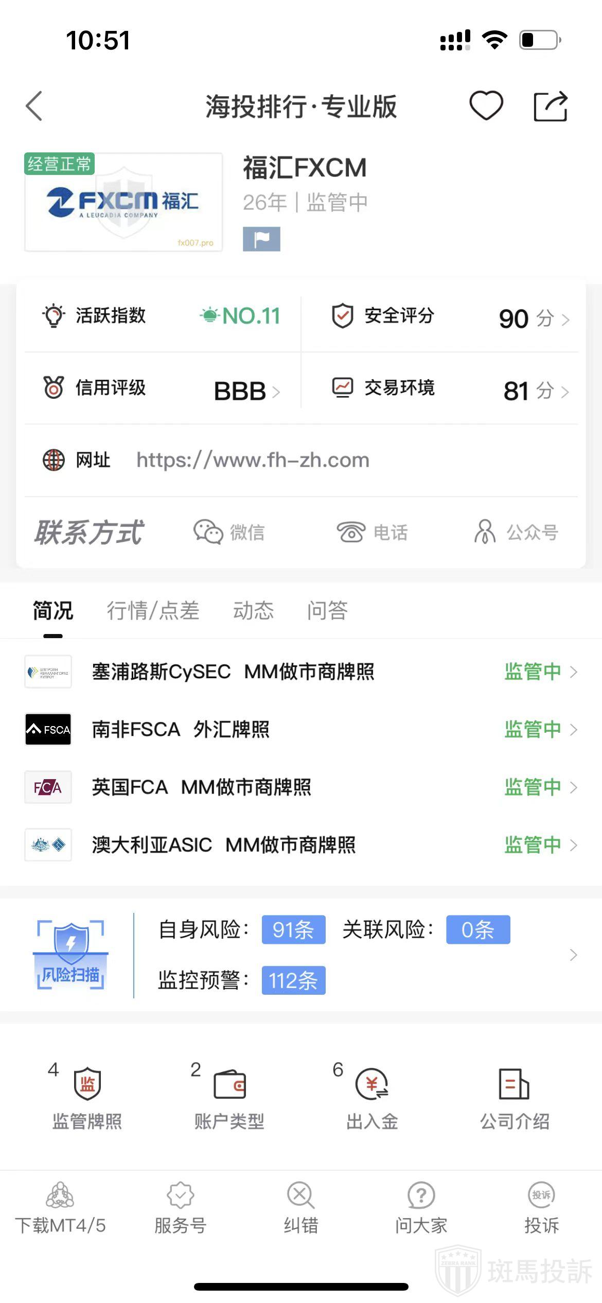 根据海投排行查询显示,这家平台叫福汇FXCM,成立于1999年,全球排名11名,安全评分90分,平台宣传称拥有英国FCA外汇牌照,澳大利亚ASIC,南非FSCA外汇牌照和塞浦路斯CySEC市场牌照等多个国家的监管牌照风险扫描预警有203条.