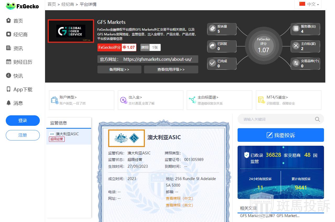 GFS的监管牌照情况非常值得关注。根据其公开信息,GFS仅持有澳大利亚金融服务授权代表的相关注册信息,并没有有效的外汇交易或经纪业务牌照。具体信息如下: