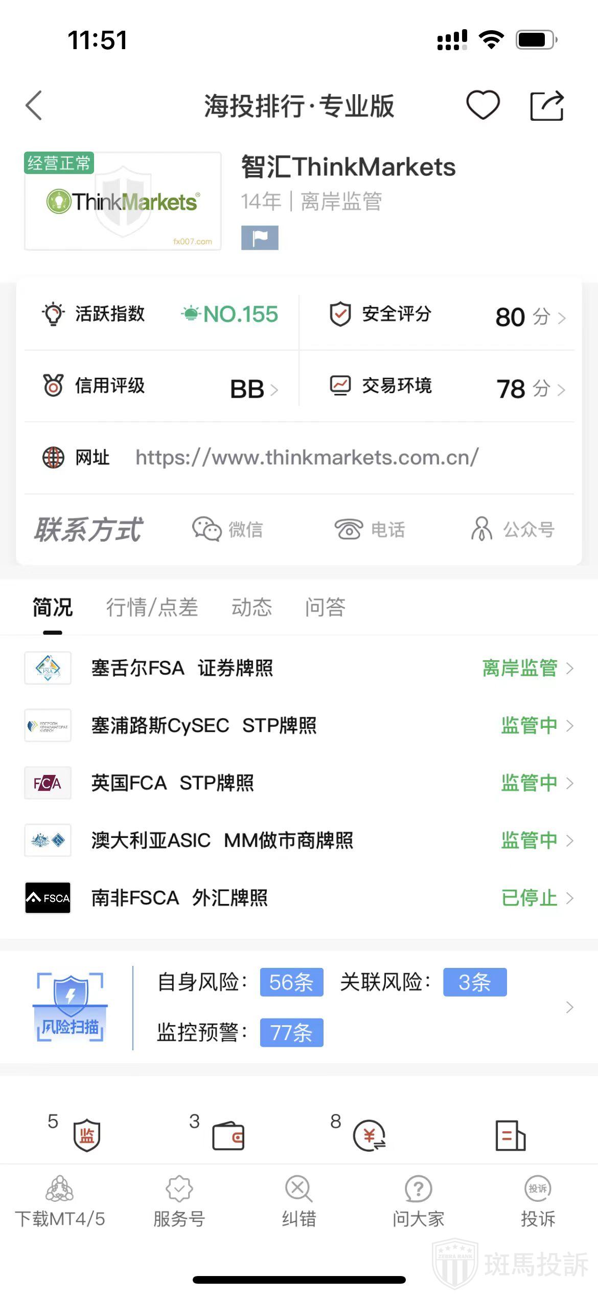 根据海投排行查询显示,这家平台叫智汇ThinkMarkets,成立于2010年,全球排名156名,安全评分80分,平台宣传称拥有英国FCA STP牌照,塞浦路斯CySEC市商牌照,塞舌尔FS证券牌照、澳大利亚ASIC市商牌照、南非FSCA外汇牌照等多个国家的监管牌照,风险扫描预警有136条.