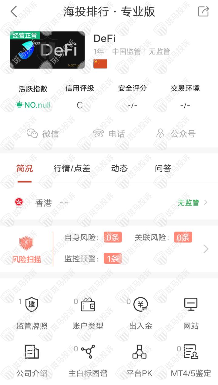 这家平台叫DeFi,成立于2021年,目前无全球排名,目前有无监管,但是没有外汇牌照,不能做外汇保证金交易,风险扫描显示1条风险,投资者资金安全无保障。网站介绍其是做加密货币投资理财,域名显示是在中国香港,网站建设非常简陋,这类型平台要多加注意,以免被骗。