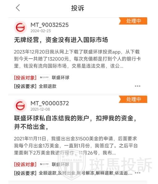 联盛环球平台现在在斑马投诉有2条投诉,2条都在处理中。