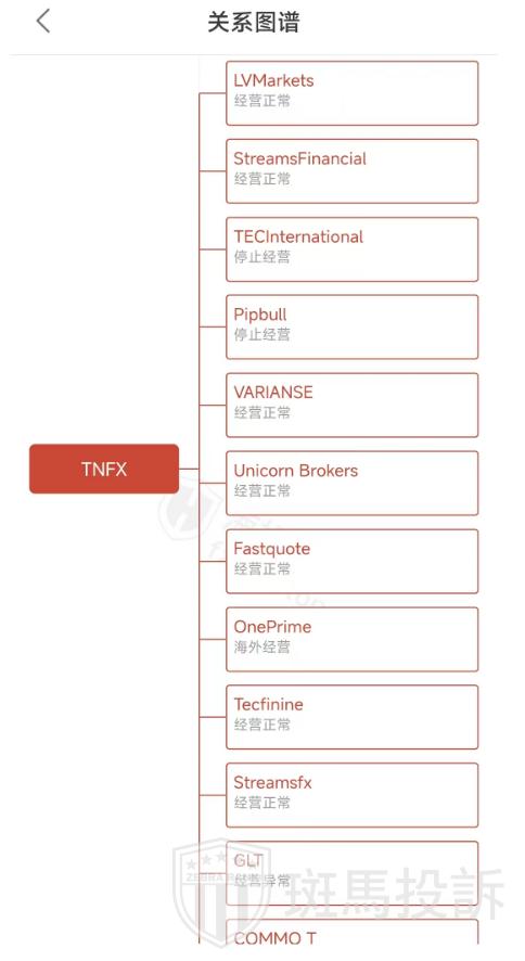 主白标关系显示,TNFX平台有15家相关联的主白标平台,其中有2家停止经营,1家经营异常。