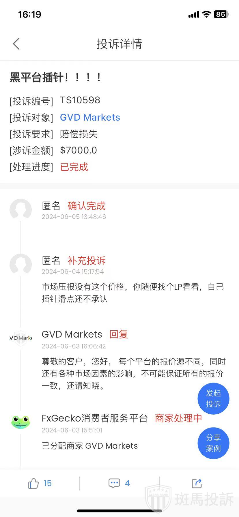 最近,有投资者通过FxGecko APP投诉黑平台GVD Markets插针!
