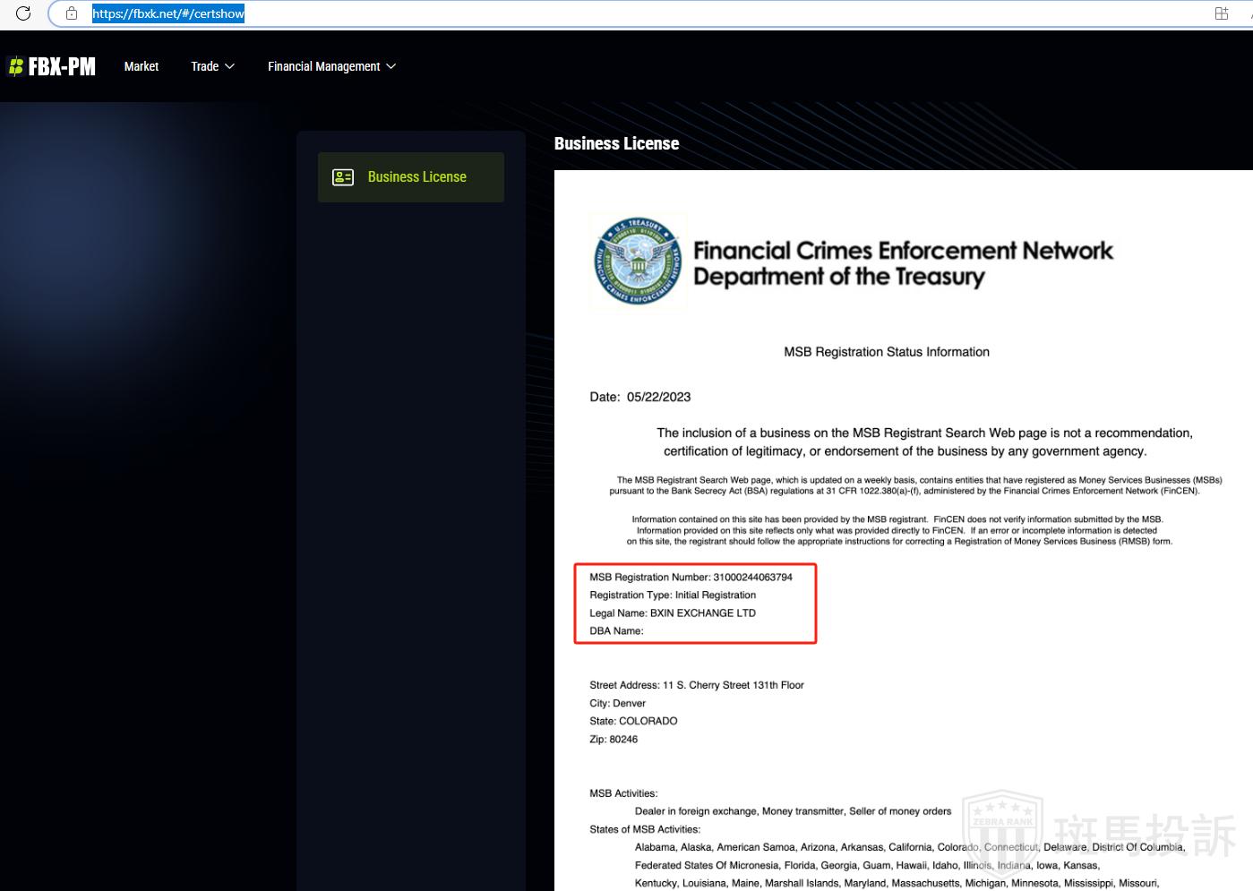 FBX-PM在其网站上披露的唯一监管信息是美国货币服务企业(MSB)注册信息,但该信息显示的公司为BXIN EXCHANGE LTD,FBX-PM疑似套牌。