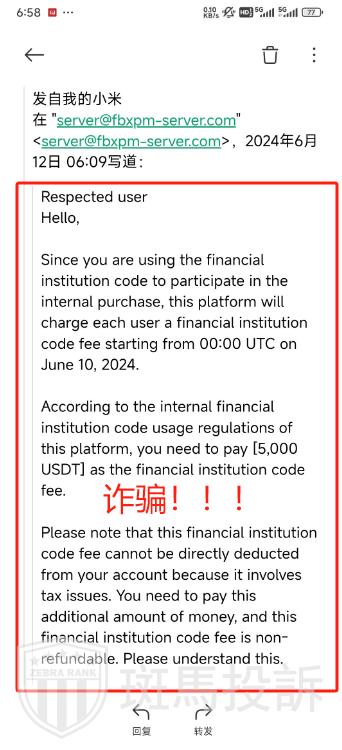 根据用户投诉,FBX-PM平台存在无法出金的问题,且属于无监管的黑平台。平台要求用户缴纳5000 USDT作为金融机构邀请码费用才能出金。这种做法是黑平台常见的套路,旨在骗取用户的资金。