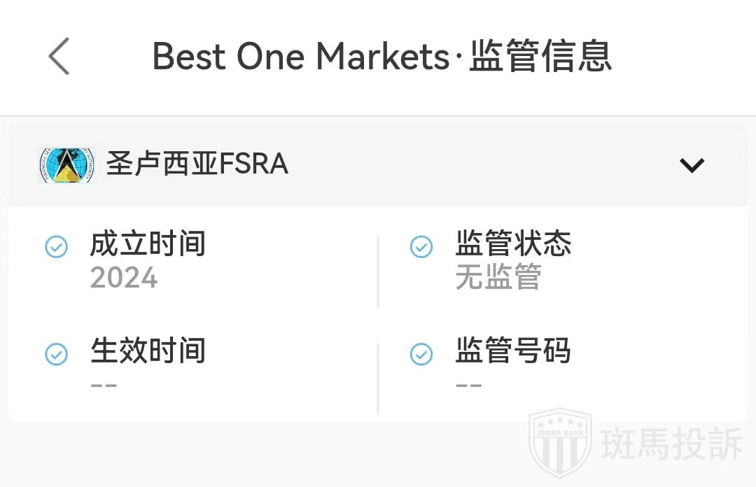 据查询,圣卢西亚FSRA指出,Best One Markets平台未在本委员会的相应登记处注册,因此未获提供投资服务或从事圣卢西亚FSRA监管范围内的其他活动的授权。望投资者警惕。