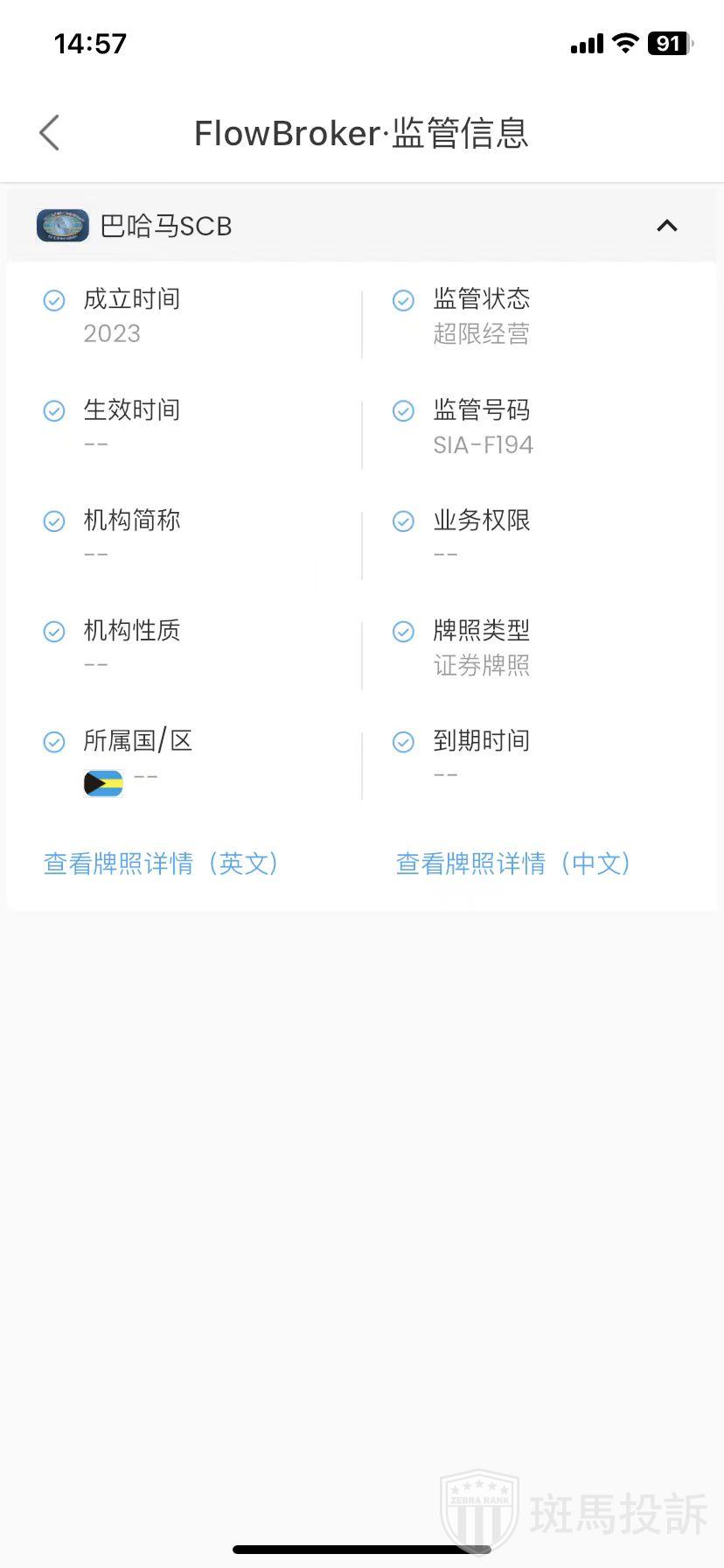 FlowBroker,在FxGecko显示1家监管信息。持有的巴哈马SCB 证券牌照监管状态为超限经营。投资者资金安全无保障!