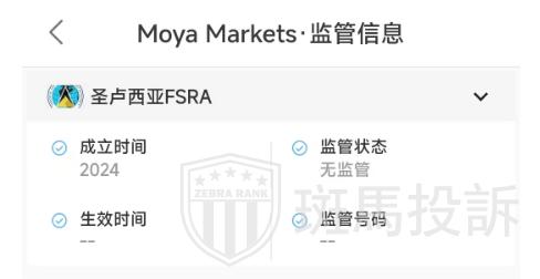 Moya Markets平台自称在圣卢西亚注册,我们在圣卢西亚FSRA并没有查到平台的监管信息,并且本身圣卢西亚FSRA就不具备监管外汇的职能,请投资者注意规避投资风险,应寻找有正规金融监管的平台进行投资。