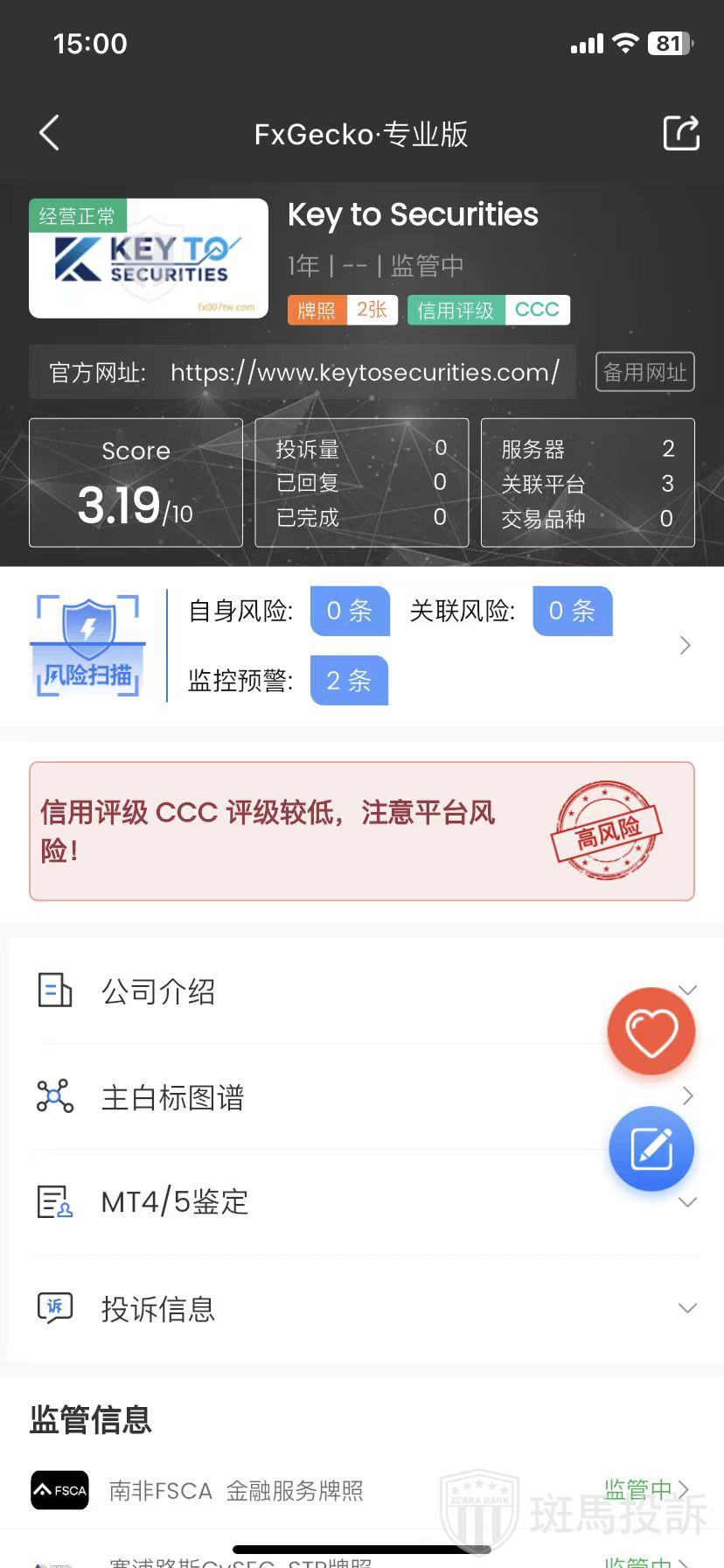 FxGecko风险提示:Key to Securities外汇平台监控预警2条。注意提前预警!