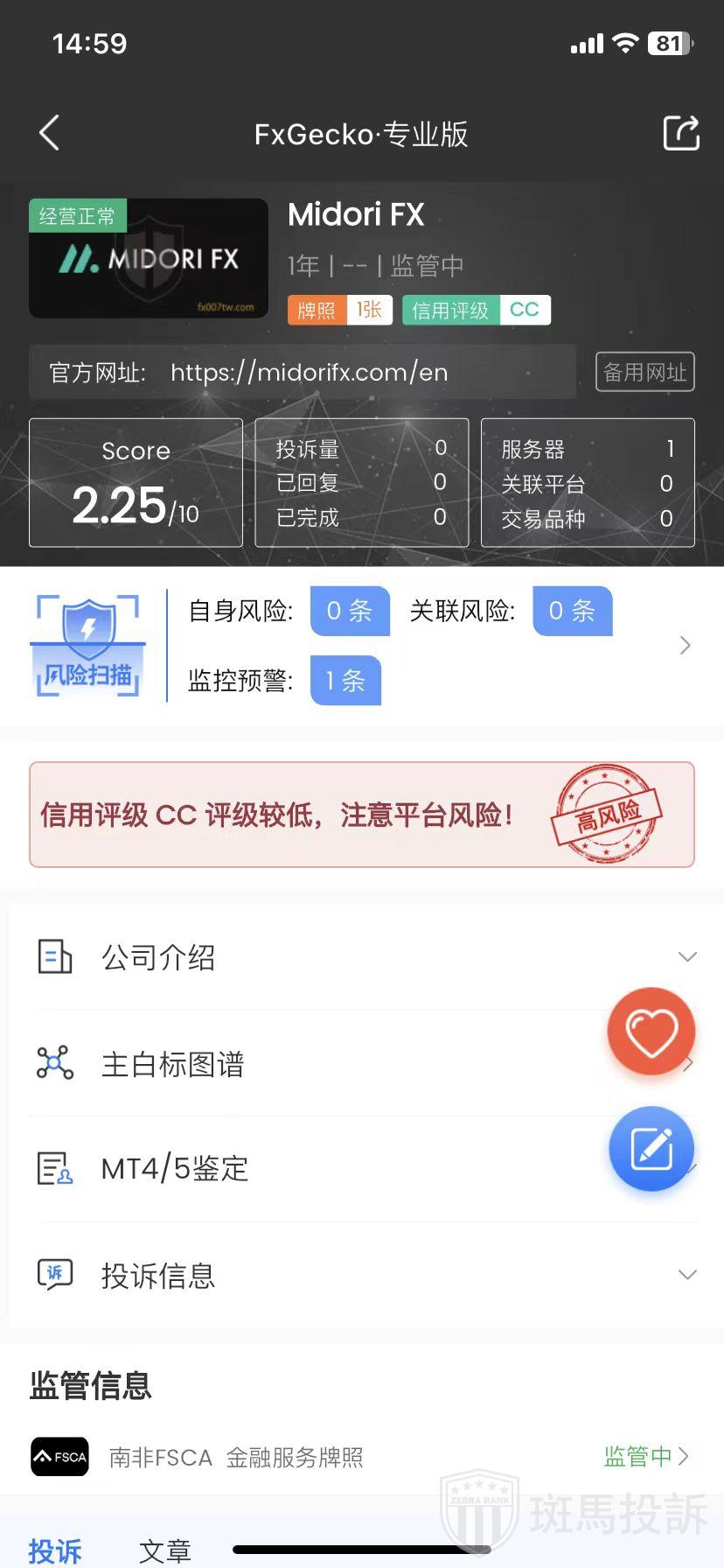 FxGecko风险提示:Midori FX外汇平台监控预警1条。注意提前预警!