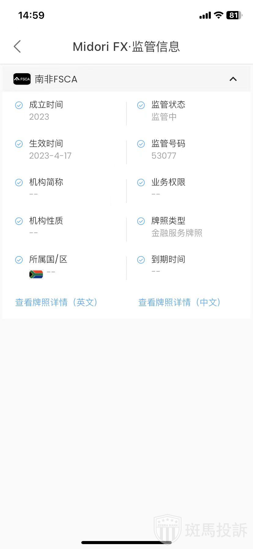Midori FX,在FxGecko显示1家监管信息。持有的南非FSCA 金融服务牌照监管状态为监管中。