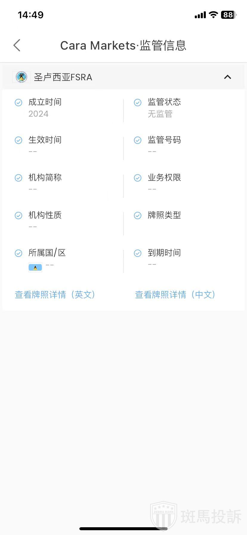 Cara Markets,在FxGecko显示1家监管信息。持有的圣卢西亚FSRA监管状态为无监管。
