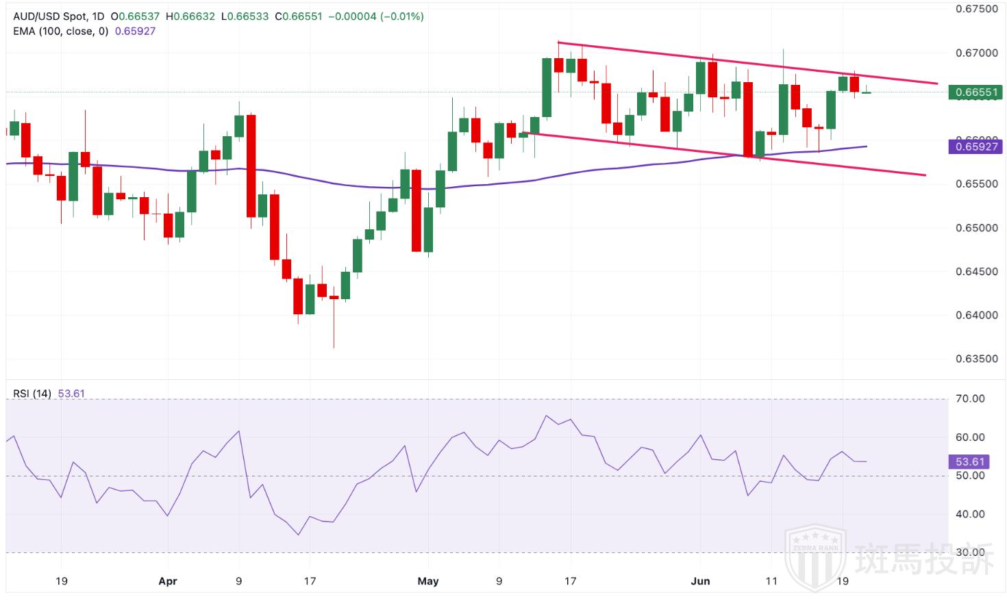 澳元/美元日内走强,自5月14日以来一直在下降趋势通道内。日线图上,该货币对在100天指数移动平均线(EMA)上方保持积极前景。14天相对强弱指数(RSI)继续显示看涨势头。