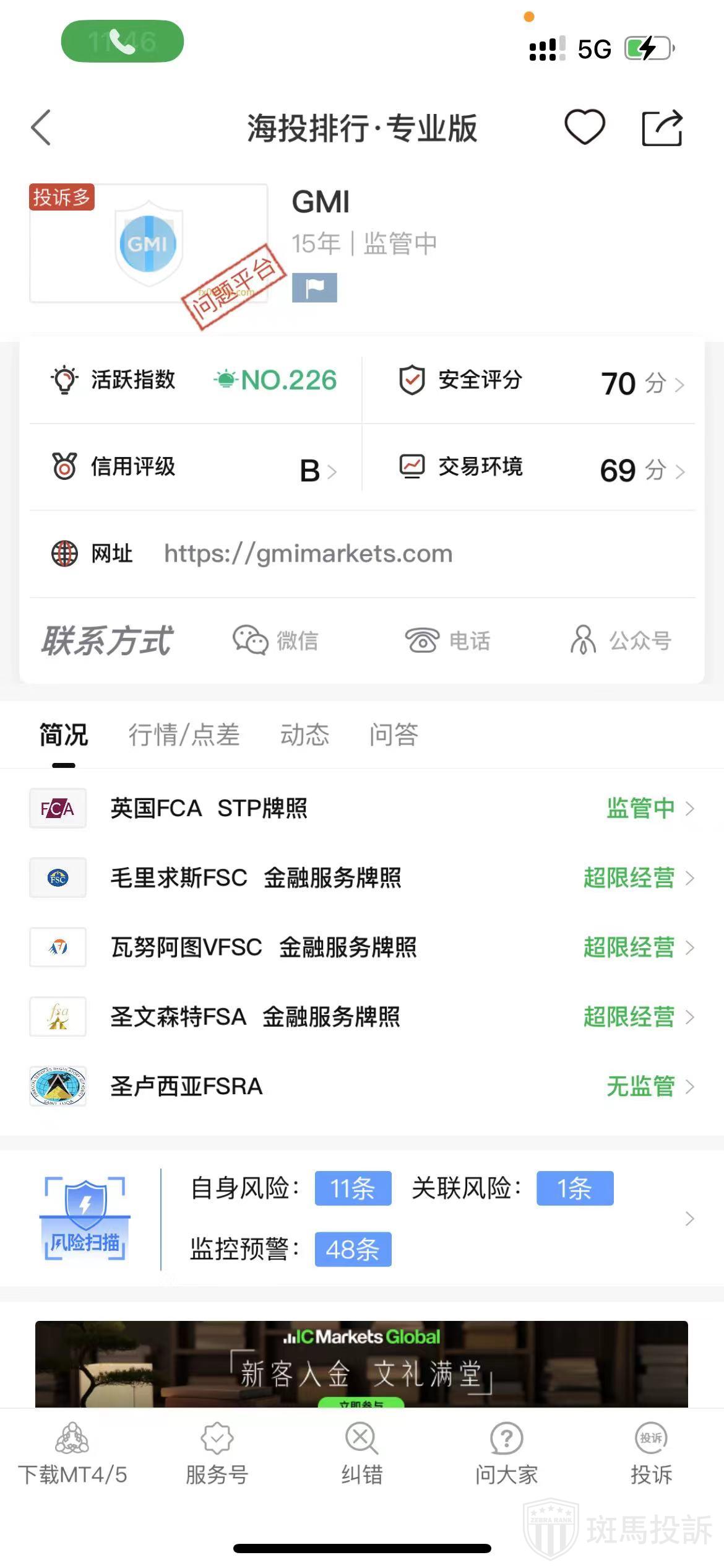 根据海投排行查询显示,这家平台叫GMI,成立于2010年,全球排名225名,安全评分70分,平台宣传称拥有英国FCA外汇牌照,瓦努阿图VFSC金融服务牌照,毛里求斯FSC外汇牌照,风险扫描预警有56条.