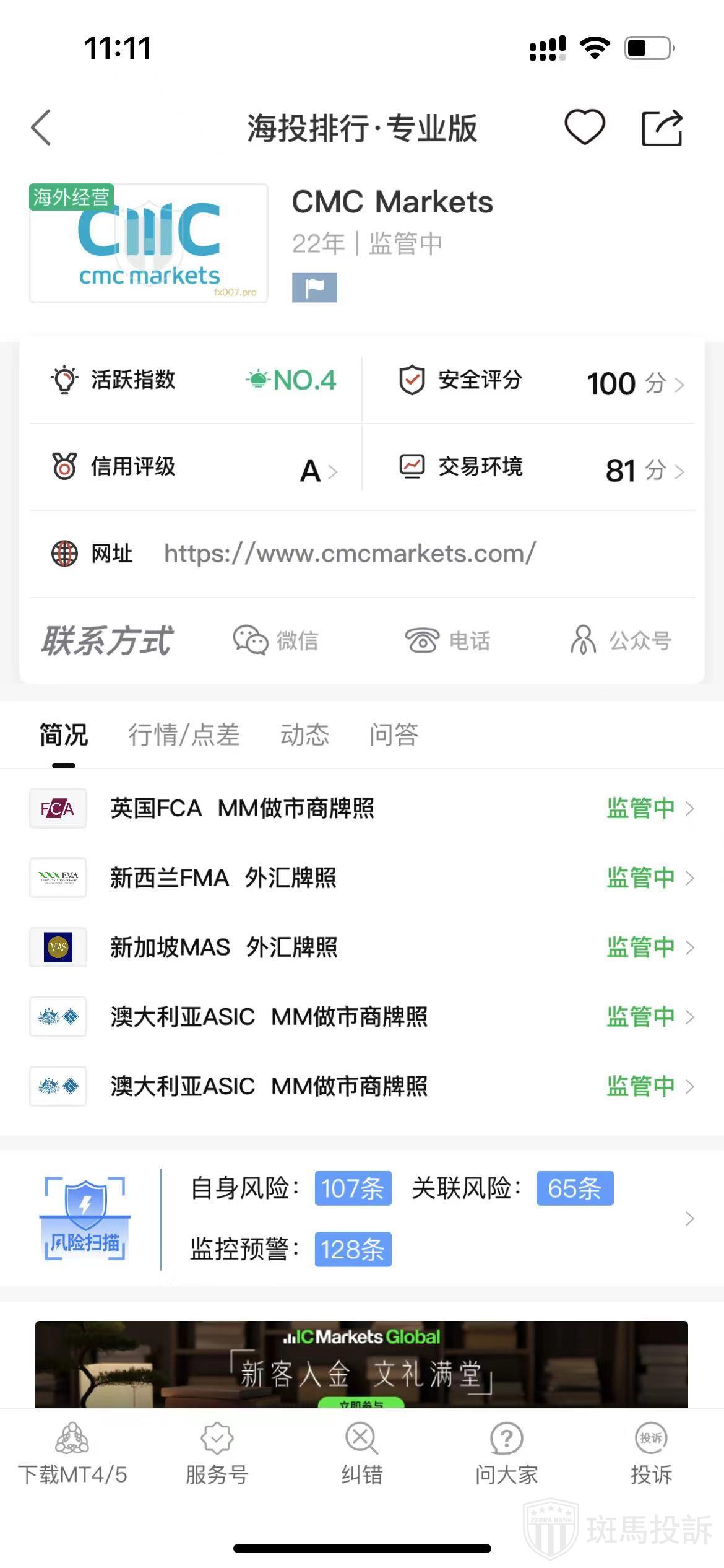 根据海投排行查询显示,这家平台叫CMC Markets,成立于2003年,全球排名4名,安全评分100分,平台宣传称拥有英国FCA外汇牌照,澳大利亚ASIC,新西兰FMA外汇牌,新加坡MAS外汇牌照等多个国家的监管牌照,风险扫描预警有233条..