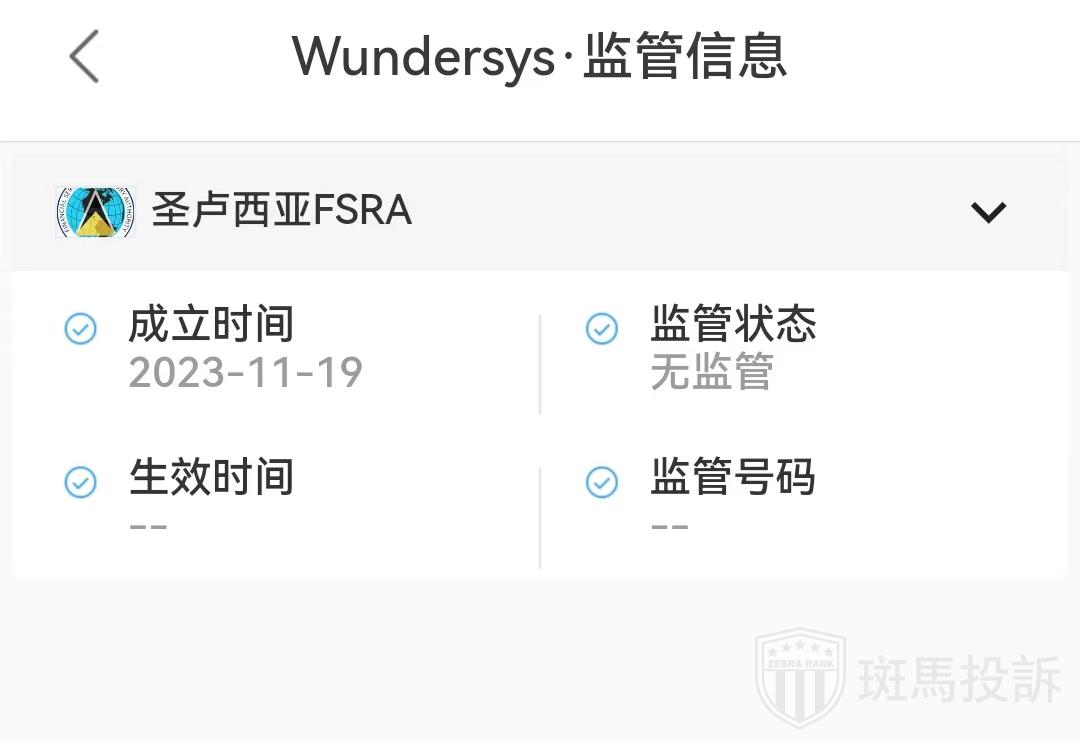 据查询,圣卢西亚FSRA指出,Wundersys平台未在本委员会的相应登记处注册,因此未获提供投资服务或从事FSRA监管范围内的其他活动的授权。望投资者警惕。