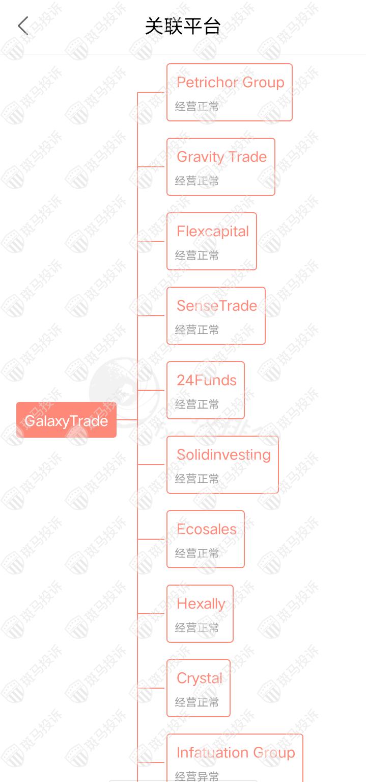 主白标关系显示,GalaxyTrade平台目前和17家平台存在关联,其中有1家存在经营异常情况。