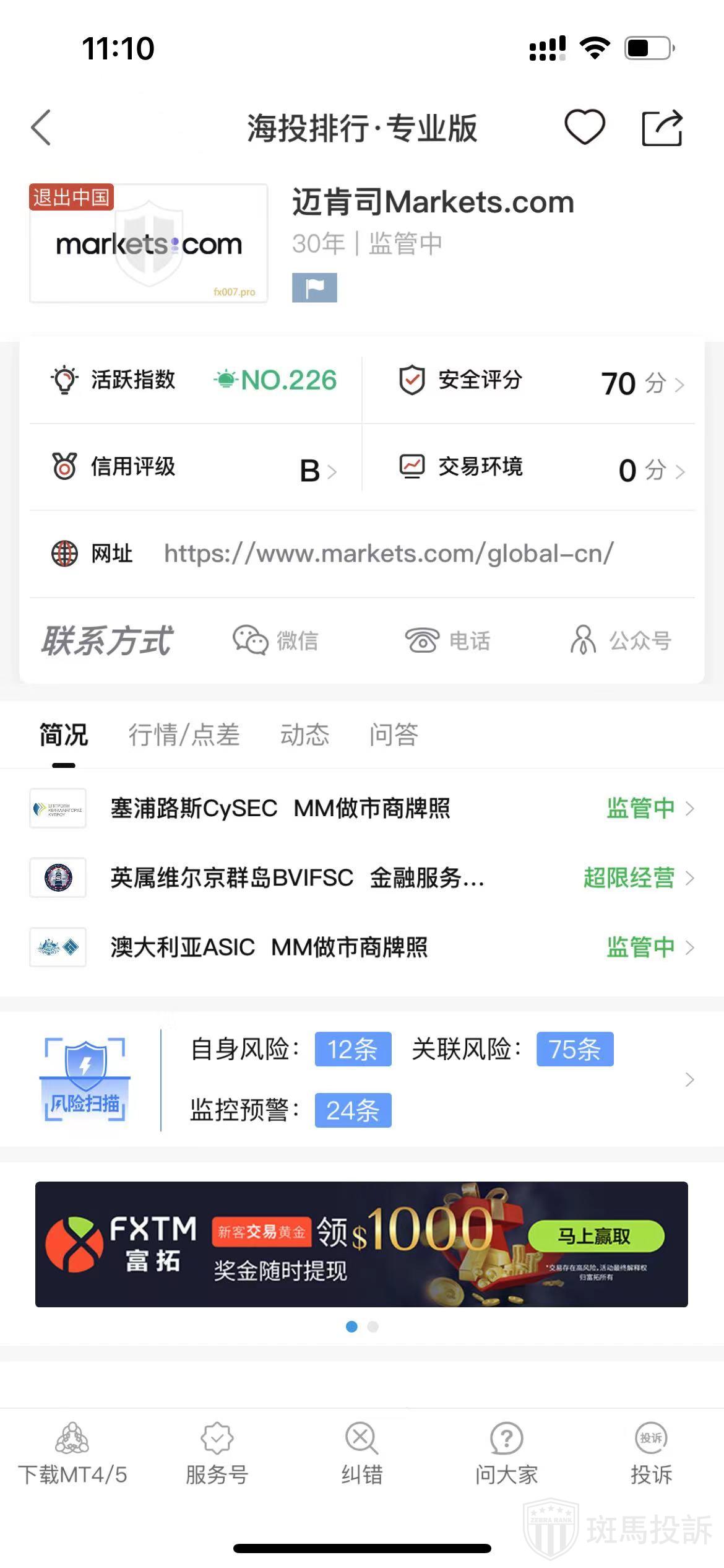 根据海投排行查询显示,这家平台叫迈肯司Markets.com,成立于1994年,全球排名225名,安全评分70分,目前有澳大利亚ASIC市商牌照,塞浦路斯CySEC MM市商牌照,英属维尔京群岛BVIFSC金融服务牌照等多个国家的监管,风险扫描预警有111条.