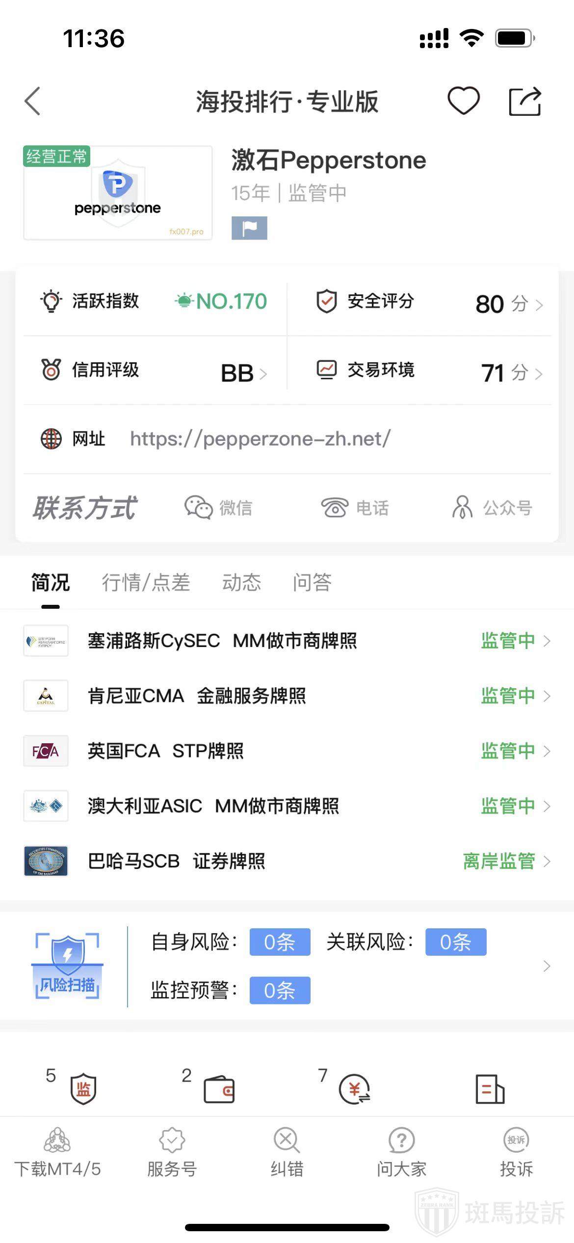 根据海投排行查询显示,这家平台叫激石Pepperstone,成立于2010年,全球排名170名,安全评分70分,平台宣传称拥有英国FCA STP牌照,塞浦路斯CySEC市商牌照、肯尼亚CMA金融服务牌照、澳大利亚ASIC市商牌照、巴哈马证券牌照等多个国家的监管牌照,风险扫描预警有111条.