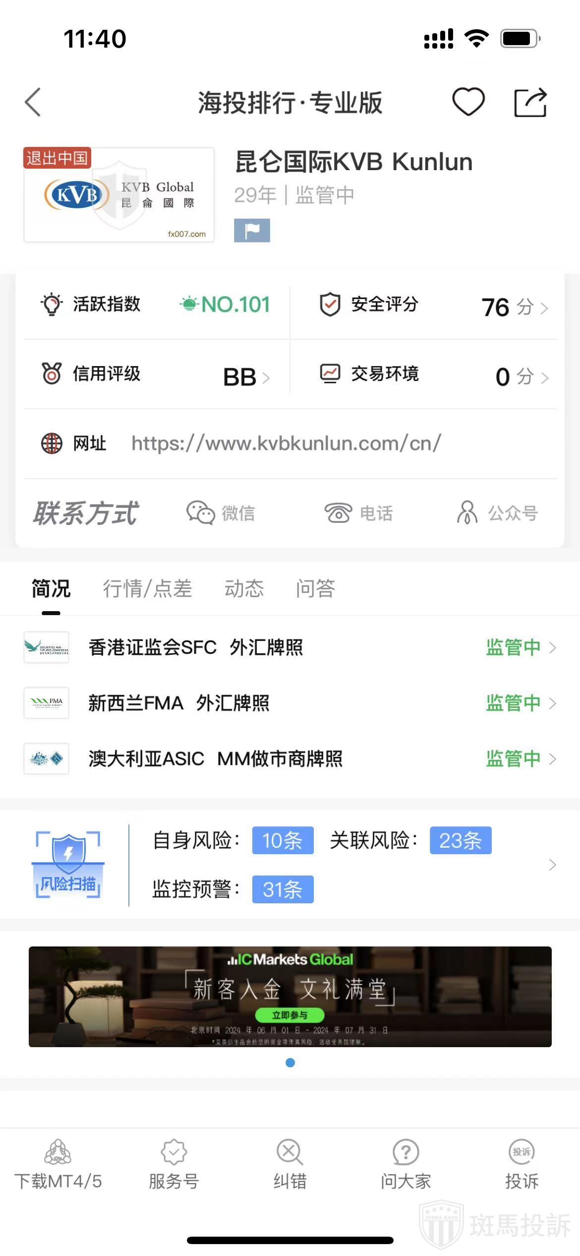 根据海投排行查询显示,这家平台叫昆仑国际KVB Kunlun,成立于1996年,全球排名101名,安全评分70分,平台宣传称目前有澳大利亚ASIC市商牌照,香港证券会SFC外汇牌照和新西兰FMA外汇牌多个国家的监管,风险扫描预警有64条.