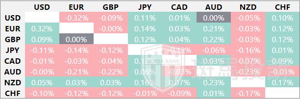 热图显示了主要货币对的波动百分比变化。基准货币从左列中选取,报价货币从顶行中选取。例如,如果投资者从左列选择澳元,然后沿水平线移动到美元,方框中显示的百分比变化即为澳元/美元波动。