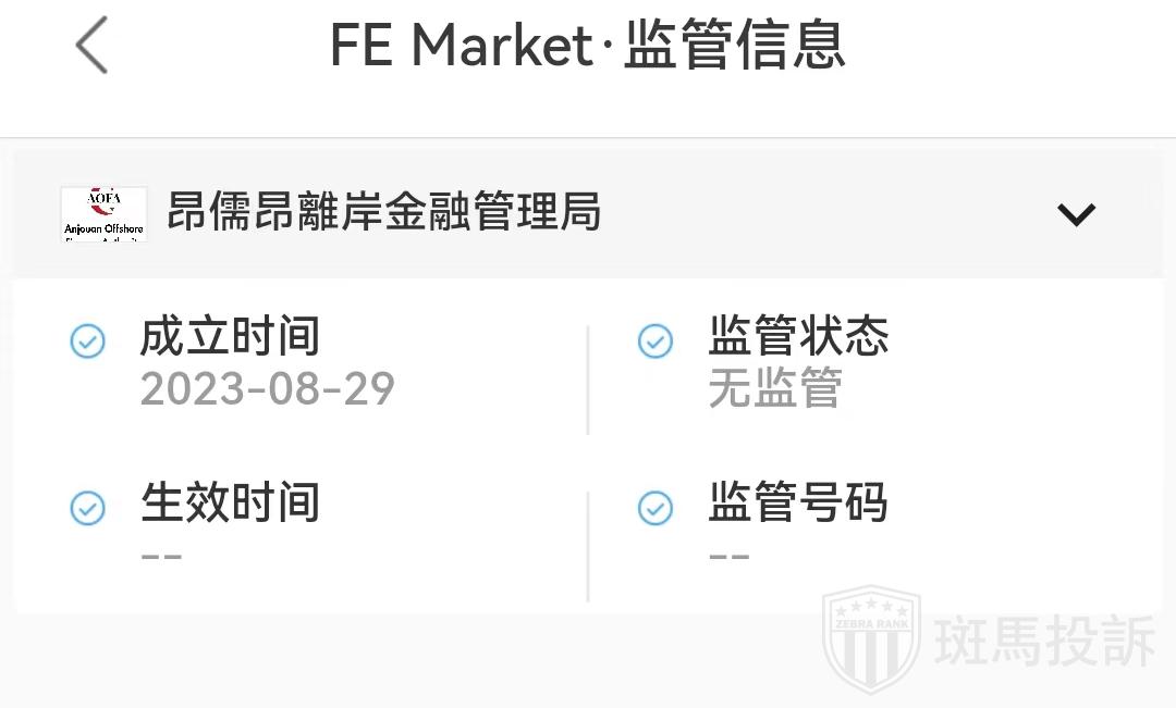 据查询,昂儒昂離岸金融管理局AOFA指出,FE Market平台未在本委员会的相应登记处注册,因此未获提供投资服务或从事AOFA监管范围内的其他活动的授权。望投资者警惕。