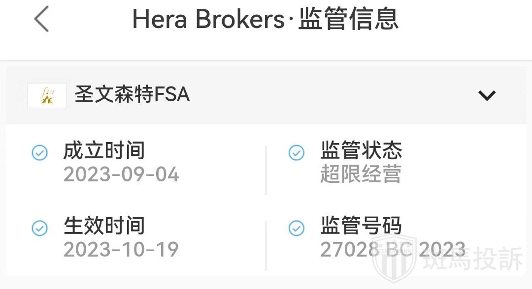 Hera Brokers平台受圣文森特FSA监管,取得金融服务牌照,监管号码:27028 BC 2023,属于超限经营范畴。
