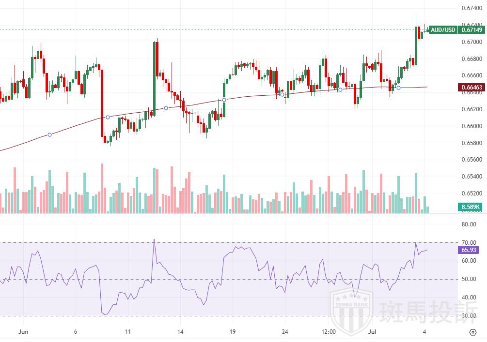 澳大利亚国内零售销售数据的强劲表现,为澳元提供了支撑,增强了市场对澳大利亚储备银行(RBA)加息的预期。尽管数据显示澳大利亚5月贸易顺差从前一个月的65.4亿澳元收窄至57.7亿澳元,但近期美元的疲软,为澳元/美元提供了推动力。