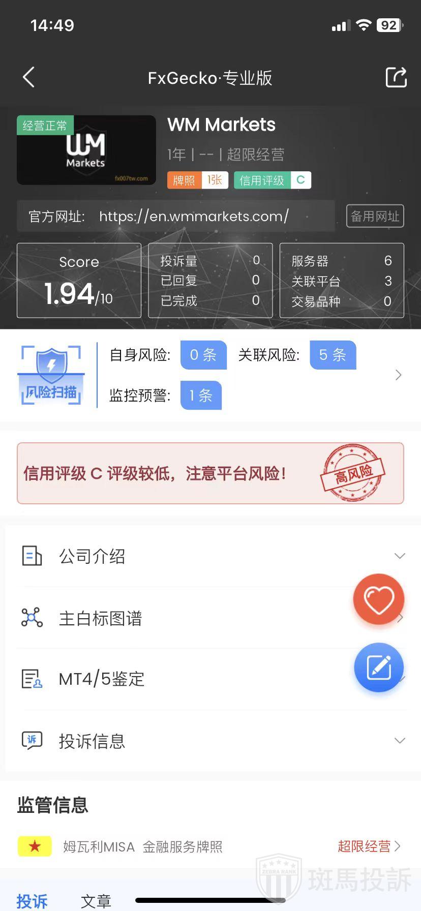 WM Markets,FxGecko评分1.94分,信用评级较低,建议投资者远离!