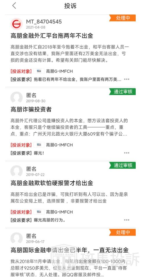 其次,高朋的客户投诉问题也值得关注。根据投诉爆料,高朋平台存在长达两年时间的拖延出金记录,甚至有投诉者表示需要报警才能取现。这样的问题严重影响了投资者的交易体验和资金安全。作为一个外汇经纪商,客户满意度是其生存和发展的基石。然而,高朋高达36条的客户投诉显示出其在这方面存在严重不足。