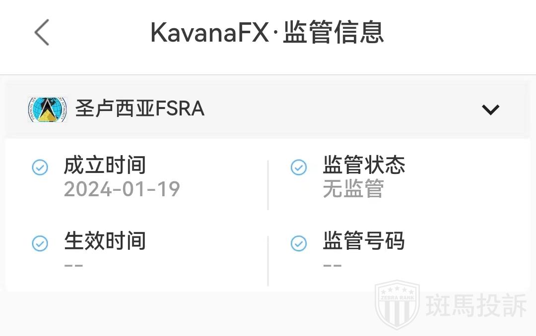 据查询,圣卢西亚FSRA指出,KavanaFX平台未在本委员会的相应登记处注册,因此未获提供投资服务或从事FSRA监管范围内的其他活动的授权。望投资者警惕。