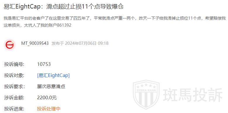 投诉者爆料:我是易汇平台的老客户了在这里交易了四五年了,平常就滑点严重一两个,昨天一下子给我滑掉止损位11个点,希望赔偿我这单损失。