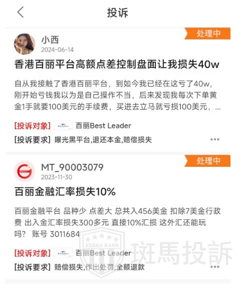 百丽目前已有2条投诉记录。投诉者反映百丽平台的汇率差价过大,高额点差导致投资者直接损失高达40万。这样的投诉情况无疑对百丽的信誉产生了负面影响,投资者在选择百丽作为交易平台时应保持谨慎。
