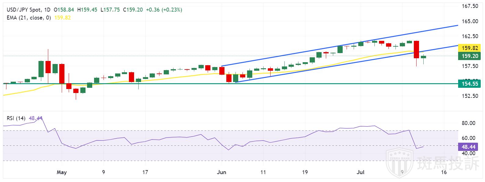 美元/日元可能会在心理价位 159.00 附近找到初步支撑。如果跌破该水平,看跌情绪可能会增强,有可能促使汇价重回 6 月份低点 154.55 附近。