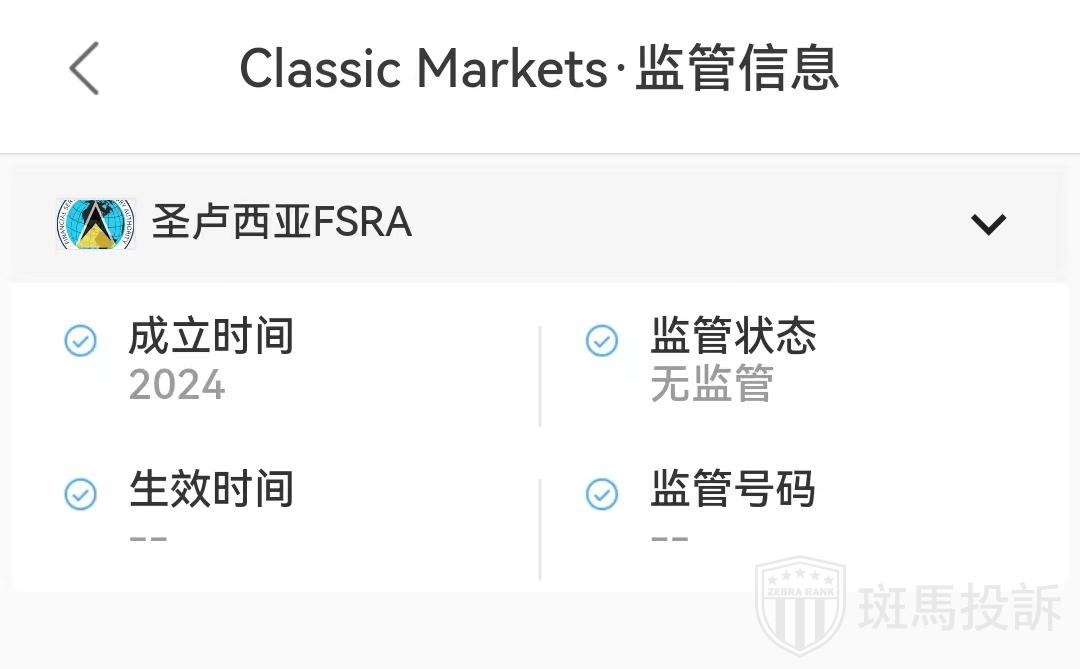 据查询,圣卢西亚FSRA指出,Classic Markets平台未在本委员会的相应登记处注册,因此未获提供投资服务或从事FSRA监管范围内的其他活动的授权。望投资者警惕。