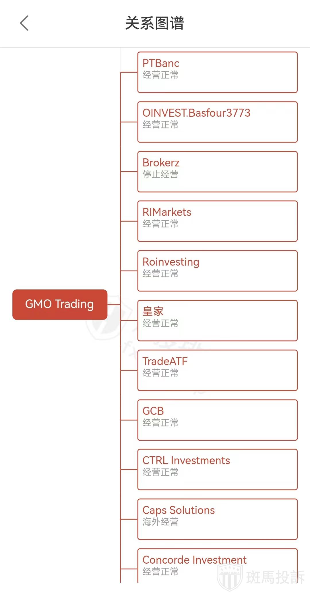 主白标关系显示,GMO Trading平台有18家相关联的平台,其中14家经营正常,1家停止经营,1家海外经营,2家经营正常。