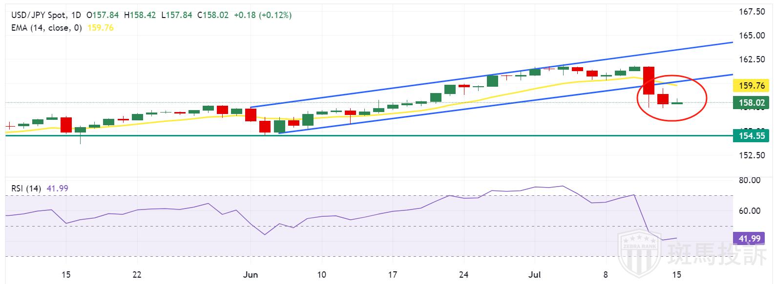美元/日元周一交投于 158.00 附近。日线图分析显示看涨趋势减弱,因为该货币对已跌破上升通道形态的下边界。此外,14 天相对强弱指数(RSI)低于 50 水平,预示着该货币对的动能下降。
