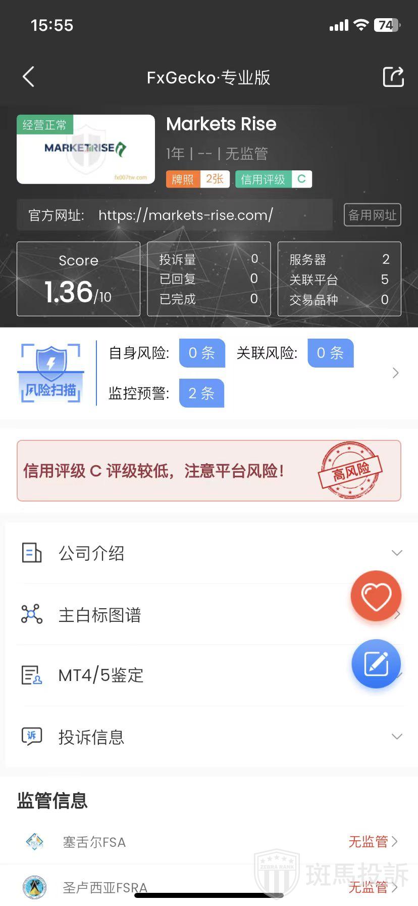 FxGecko风险提示:Markets Rise外汇平台监控预警2条。注意提前预警!